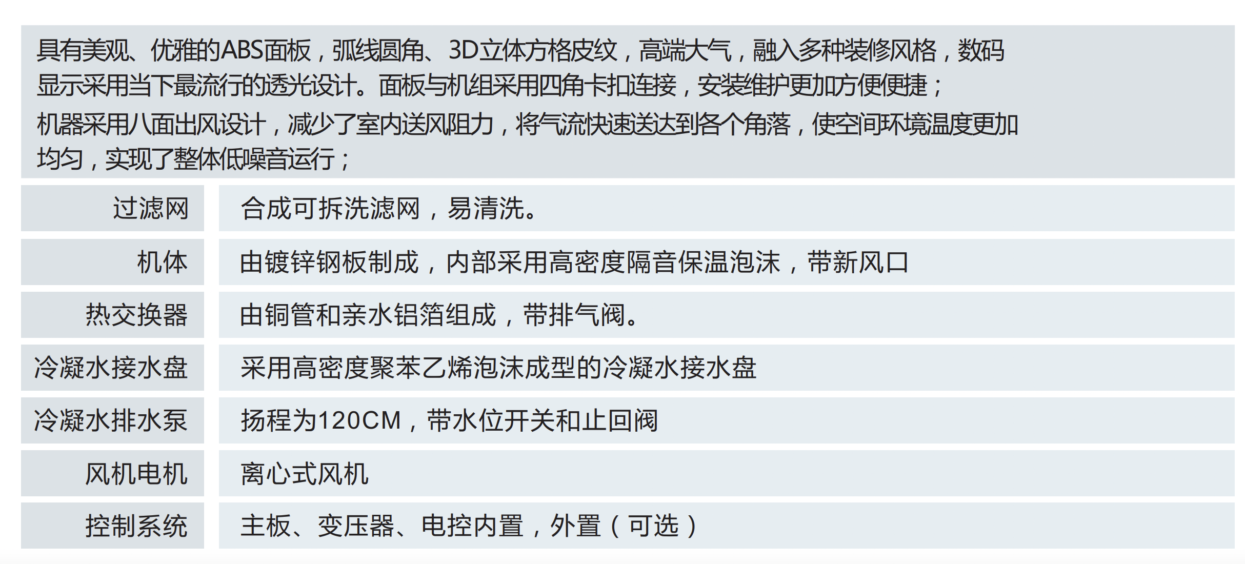 具有美觀、優(yōu)雅的ABS面板,弧線(xiàn)圓角、3D立體方格皮紋,高端大氣,融入多種裝修風(fēng)格。面板與機(jī)組采用四角卡扣鏈接,安裝維護(hù)更加方便便捷。